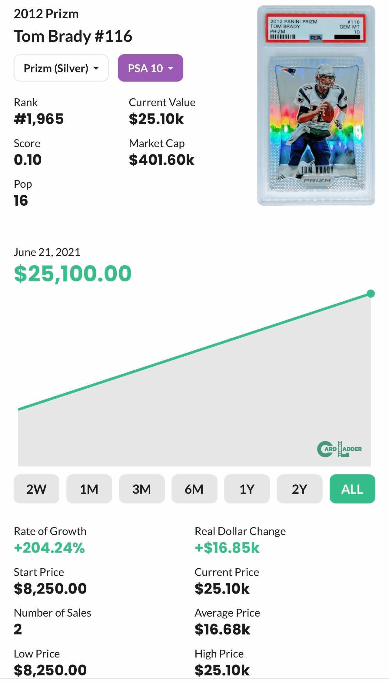 It seems like most of the sales over the past few months have been downers until TB Teflon had something to say about it this week when his 2012 Panini Prizm Silver sold for a record smashing $25,100! Now thatās a lot of chowder.Ā