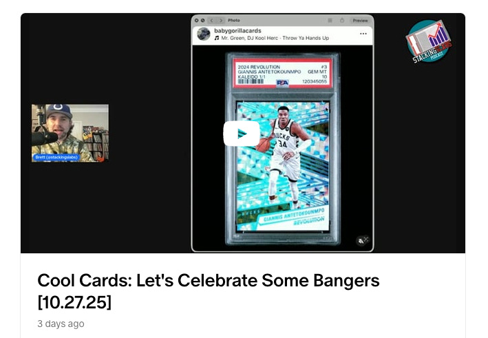 Stacking Slabs Patreon is the one stop shop for exclusive content AND video versions of all the shows that you listen to on the main feed. We’re dropping every new episode of Card Ladder Confidential in video format an entire damn day before it hits the main feed. Also, you get full episodes of Patreon exclusive series like Cool Cards. Do you like to watch collectors talk about sports cards? This might be the space for you.