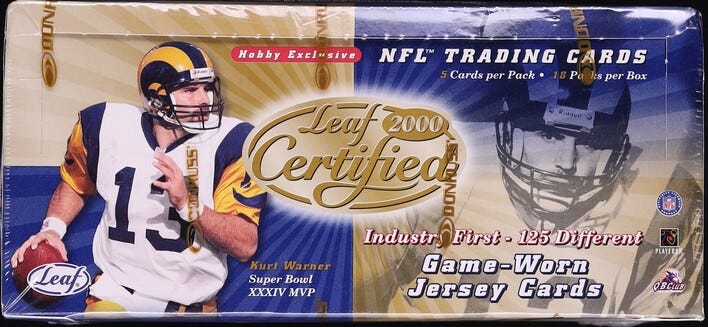 The final hobby box that we need to talk about is the 2000 Leaf Certified. This is a product with excellent parallels and there’s game worn jersey cards. Also, let’s not forget about the Tom Brady rookie of it all!