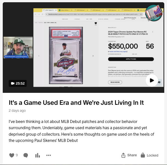 The Stacking Slabs Patreon group is very much my test kitchen for new concepts and ideas. There’s always topics that I want to explore, but don’t get to on the main feed. I treat these as opportunities to share more with a smaller group of collectors. This week I explored the game used patch of it all. It’s not my primary lane of collecting, however, I think there’s a lot of important lessons we can learn from understanding what’s happening in the market.