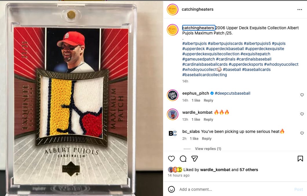 I’ve been following @catchingheaters for a long time. I don’t collect baseball, but really enjoy the passion he brings to his page. He’s been posting some Albert Pujols heaters lately. Go give Matt a follow.
