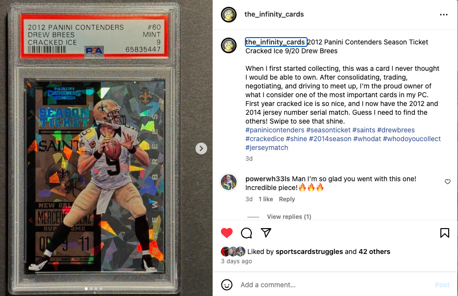 I always enjoy the passion that @the_infinity_cards puts into each post. Hayden is a passionate collector of Drew Brees, 2014 Totally Certified Mirrors, 2022 Shining Stars Gold, and likely anything else that shines bright. Give him a follow if you want to see some cool shiny football cards.