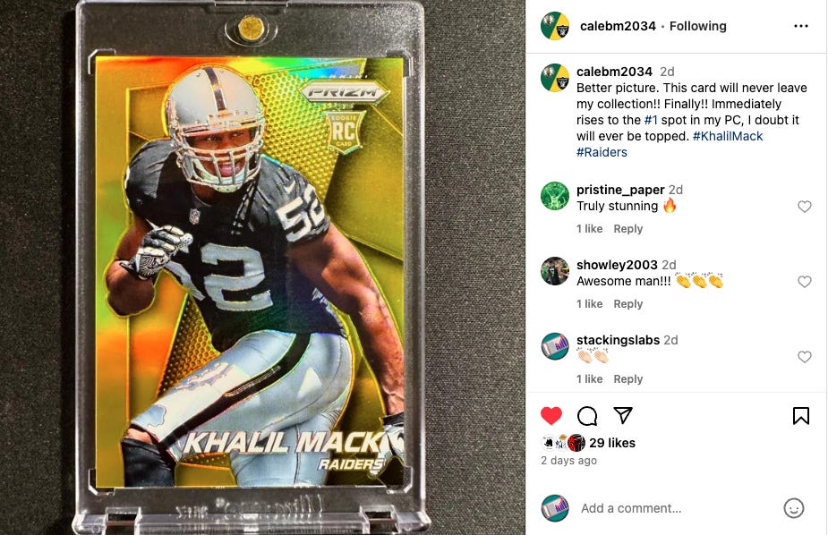 I stumbled across a cool mail day video from @calebm2034 this week. He was showing his new pick up of a 2014 Khalil Mack Gold Prizm Rookie card. The card is amazing, but his story on what Mack meant to him was even more special.