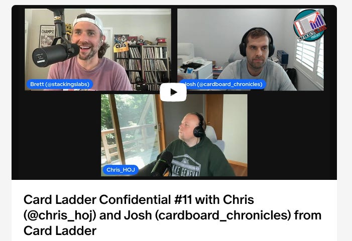 Stacking Slabs Patreon is the one stop shop for exclusive content AND video versions of all the shows that you listen to on the main feed. This week we dropped a new episode of Card Ladder Confidential. I drop video versions of each chat 24 hours before it hits the main feed.